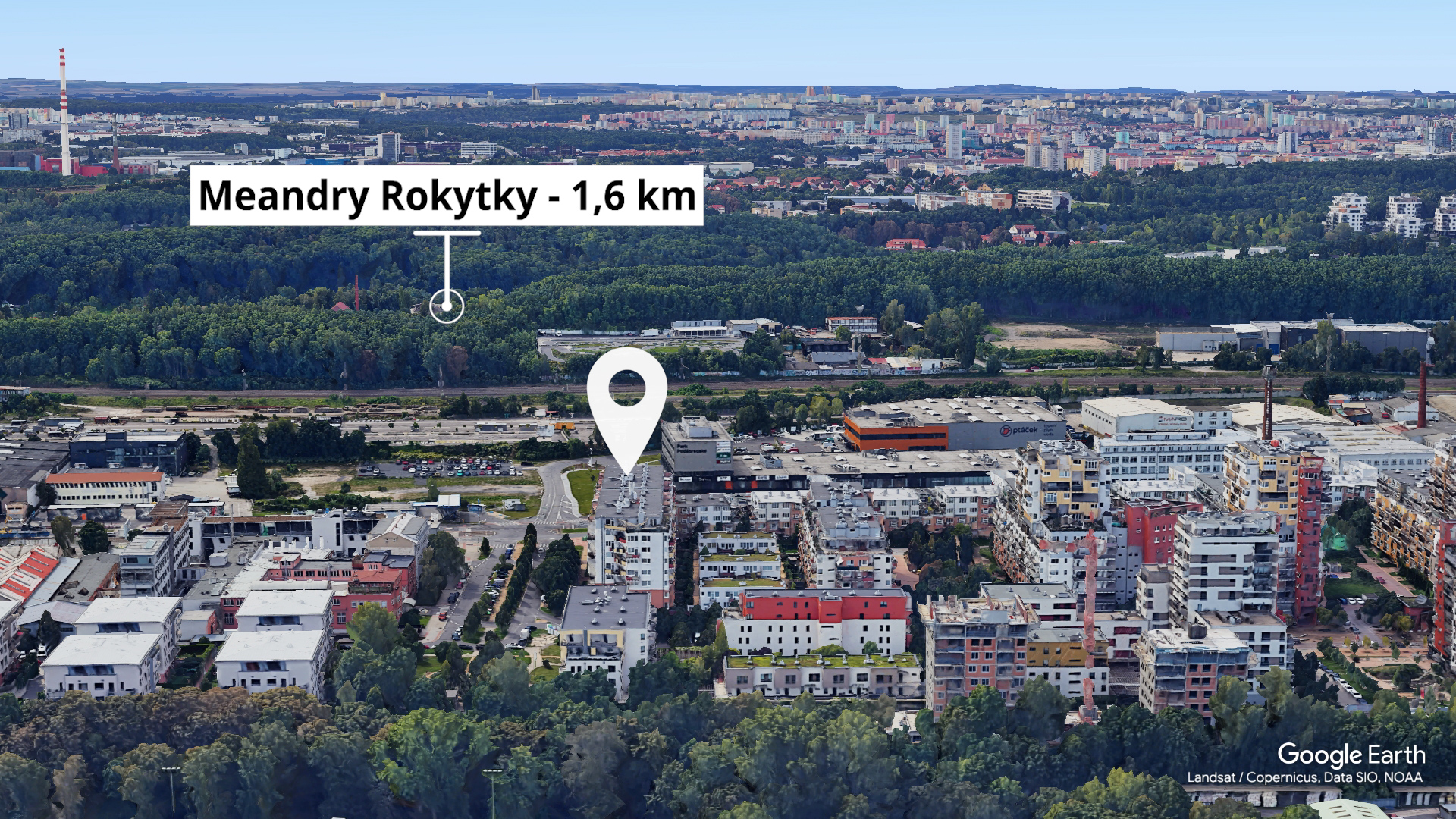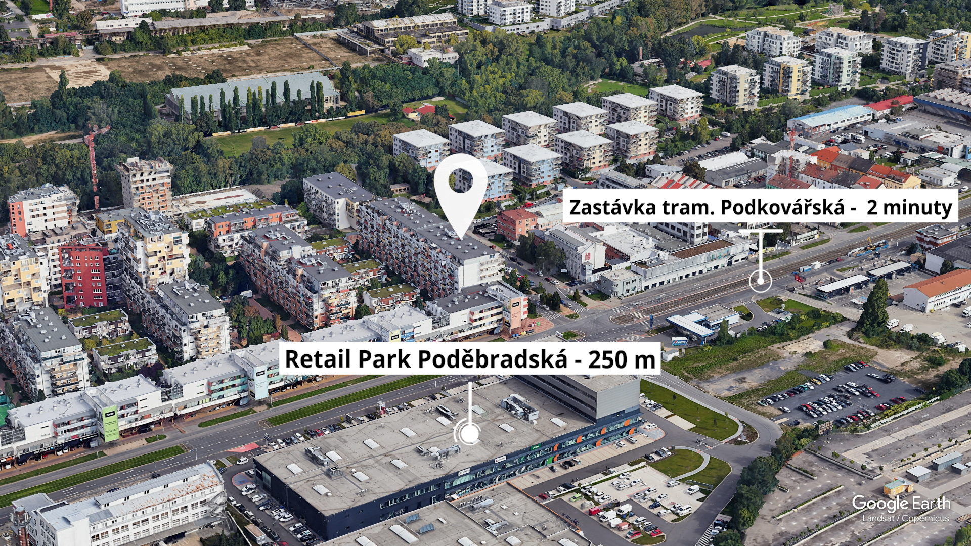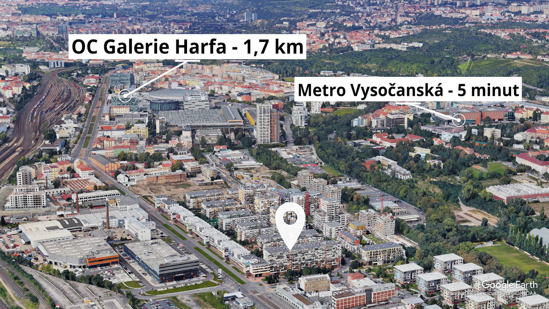 Byt je velmi dobře umístěn s výborným přístupem do centra. V blízkosti se nachází zastávka autobusu, tramvaje, vlaku. Metro Vysočanská, Kolbenova. Pro nákup je v okolí spousta možností od malých večerek až po nákupní centrum Harfa. Za kulturou můžete vyrazit do mnoha kavárniček v okolí bytu, či do blízké O2 Arény. K procházkám zvou meandry Rokytky.